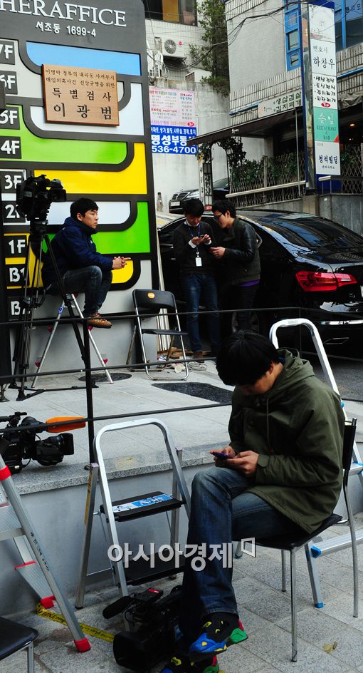 [아시아경제 백소아 인턴 기자] 이명박 대통령의 큰 형 이상은씨의 내곡동 특검 소환을 이틀 앞둔 29일 서울 서초구에 위치한 특검사무실에서 취재진들이 대기하고 있다.백소아 인턴 기자 sharp2046@<ⓒ세계를 보는 창 경제를 보는 눈, 아시아경제(www.asiae.co.kr) 무단전재 배포금지>