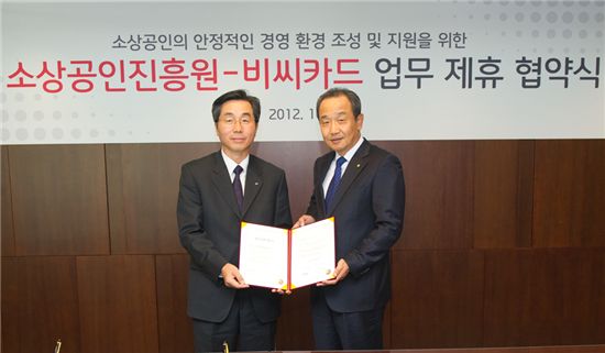 ▲이강태 BC카드 사장(오른쪽)과 이용두 소상공인진흥원 원장(왼쪽)이 31일 서초동 BC카드 본사에서 열린 '소상공인 활성화를 위한 협약식' 이후 기념촬영을 하고 있다.