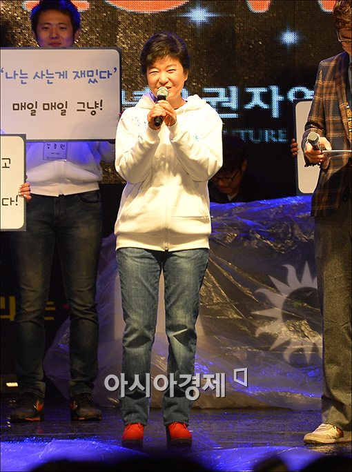 [아시아경제 윤동주 기자] 박근혜 새누리당 대선 후보가 31일 서울 광화문광장에서 열린 ‘2012청연문화축제 - 청년이 바라는 지도자 쇼(청바지쇼)‘에 참석해 흰 티셔츠와 청바지, 빨간 신발을 신고 무대에 올라 인사말을 하고 있다.윤동주 기자 doso7@<ⓒ세계를 보는 창 경제를 보는 눈, 아시아경제(www.asiae.co.kr) 무단전재 배포금지>