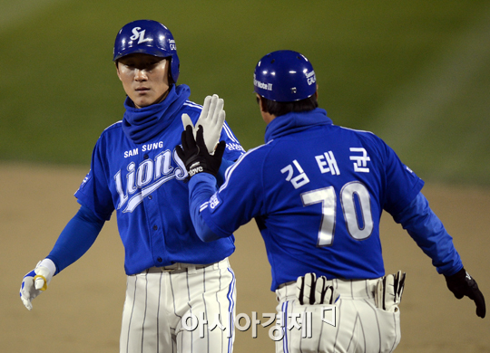 [아시아경제 정재훈 기자] 삼성 배영섭이 1일 오후 잠실야구장에서 열린 '2012 팔도 프로야구 한국시리즈' SK 와이번스와 삼성 라이온즈의 6차전 경기 3회초 1사 무주자 상황에서 안타를 친 뒤 김태균 코치와 하이파이브하고 있다.정재훈 기자 roze@<ⓒ세계를 보는 창 경제를 보는 눈, 아시아경제(www.asiae.co.kr) 무단전재 배포금지>