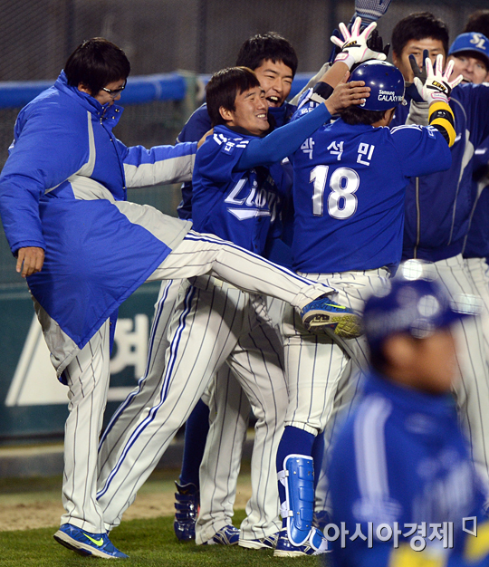 [아시아경제 정재훈 기자] 삼성 박석민이 1일 오후 잠실야구장에서 열린 '2012 팔도 프로야구 한국시리즈' SK 와이번스와 삼성 라이온즈의 6차전 경기 4회초 1사 1루 상황에서 투런 홈런을 친 뒤 동료들의 환영을 받고 있다.정재훈 기자 roze@<ⓒ세계를 보는 창 경제를 보는 눈, 아시아경제(www.asiae.co.kr) 무단전재 배포금지>