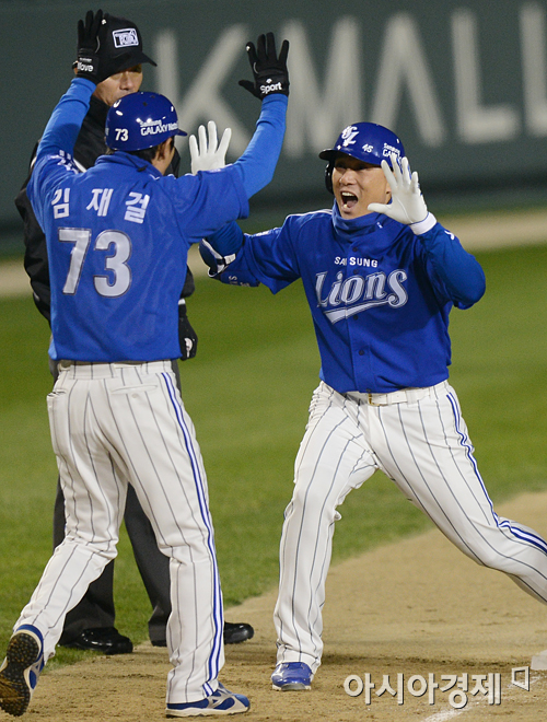 [아시아경제 정재훈 기자] 1일 오후 잠실야구장에서 열린 '2012 팔도 프로야구 한국시리즈' SK 와이번스와 삼성 라이온즈의 6차전 경기 4회초 2사 만루 상황에서 이승엽이 싹쓸이 3루타를 친 뒤 기뻐하고 있다.정재훈 기자 roze@<ⓒ세계를 보는 창 경제를 보는 눈, 아시아경제(www.asiae.co.kr) 무단전재 배포금지>