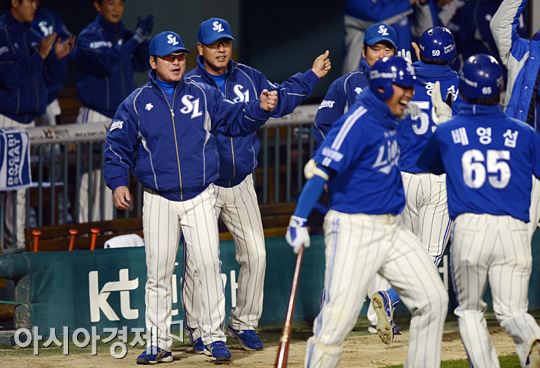 [아시아경제 정재훈 기자] 1일 오후 잠실야구장에서 열린 '2012 팔도 프로야구 한국시리즈' SK 와이번스와 삼성 라이온즈의 6차전 경기 4회초 2사 만루 상황에서 이승엽의 싹쓸이 3루타에 홈을 밟은 선수들이 류중일 감독과 함께 기뻐하고 있다.정재훈 기자 roze@<ⓒ세계를 보는 창 경제를 보는 눈, 아시아경제(www.asiae.co.kr) 무단전재 배포금지>
