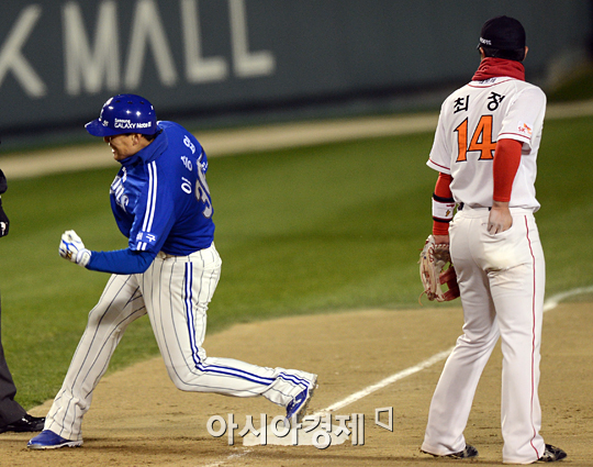 [아시아경제 정재훈 기자] 1일 오후 잠실야구장에서 열린 '2012 팔도 프로야구 한국시리즈' SK 와이번스와 삼성 라이온즈의 6차전 경기 4회초 2사 만루 상황에서 이승엽이 싹쓸이 3루타를 친 뒤 기뻐하고 있다.정재훈 기자 roze@<ⓒ세계를 보는 창 경제를 보는 눈, 아시아경제(www.asiae.co.kr) 무단전재 배포금지>
