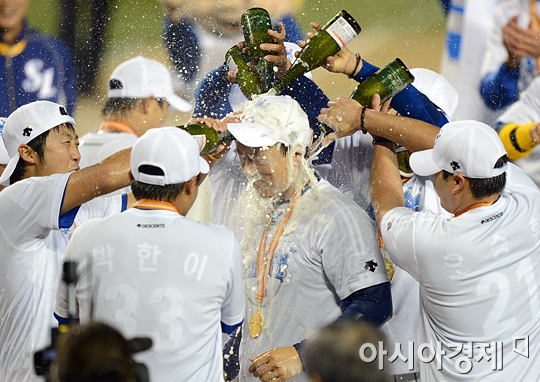 [아시아경제 정재훈 기자] 삼성 라이온즈가 1일 오후 잠실야구장에서 열린 '2012 팔도 프로야구 한국시리즈' SK 와이번스와의 6차전 경기에서 7:0 승리를 거두며 한국시리즈 우승을 차지했다. 한국시리즈 MVP로 선정된 이승엽이 동료들의 축하 샴페인 세례를 받고 있다.정재훈 기자 roze@<ⓒ세계를 보는 창 경제를 보는 눈, 아시아경제(www.asiae.co.kr) 무단전재 배포금지>
