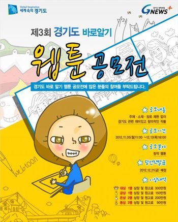 【수원=이영규 기자】경기도가 참신하고 재미있는 웹툰을 공모한다. 경기도는 11월5일부터 12월13일까지 제3회 경기도 바로알기 웹툰 공모를 실시한다고 4일 밝혔다. 주제는 ▲일상 이야기 ▲경기도 주요 정책 ▲가족 등 내용 제한이 없다. 참가지역이나 나이 제한도 없으며 대한민국 국민이면 누구나 참가할 수 있다. 대상 300만 원을 포함해 모두 7명의 수상자에게 도지사 상장 및 총 850만 원의 상금이 수여된다. 모집 마감은 12월 13일 오후 6시며, 수상작 발표는 12월 21일이다. 자세한 사항은 경기도 홈페이지(www.gg.go.kr) 및 경기도정책포털 G뉴스플러스 홈페이지(gnews.gg.go.kr)를 참고하면 된다.이영규 기자 fortune@<ⓒ세계를 보는 창 경제를 보는 눈, 아시아경제(www.asiae.co.kr) 무단전재 배포금지>이영규 기자 fortune@<ⓒ아시아 대표 석간 '아시아경제' (www.newsva.co.kr) 무단전재 배포금지>