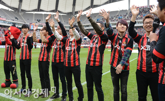 [아시아경제 정재훈 기자] 4일 오후 서울월드컵경기장에서 열린 '현대 오일뱅크 K리그 2012' FC서울과 수원 삼성의 슈퍼매치에서 슈퍼스타K4 TOP4가 관중들에게 인사를 하고 있다.정재훈 기자 roze@<ⓒ세계를 보는 창 경제를 보는 눈, 아시아경제(www.asiae.co.kr) 무단전재 배포금지>