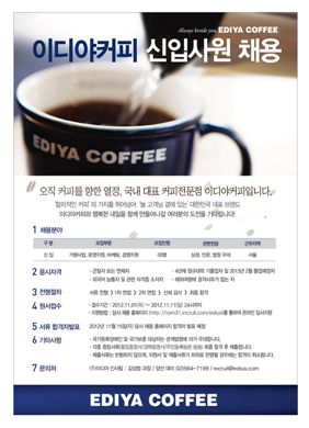 [아시아경제 오주연 기자]커피전문기업 이디야 커피는 5일부터 오는 11일까지 신입사원을 공개 채용한다고 밝혔다.응시자격은 4년제 정규대학 기졸업자 및 2013년 2월 졸업예정자로 해외여행에 결격사유가 없으면 누구나 지원 가능하다.채용분야는 가맹사업, 운영지원, 마케팅, 경영지원 등 총 4개 부문이며 서류전형과 1·2차 면접, 신체검사를 통해 최종합격자를 선발한다.상경, 인문, 법정 등 관련 전공자 및 국가등록장애인, 국가보훈 대상자는 관계법령에 의거해 우대하며 서류전형 원서접수는 이디야 채용 홈페이지(//rpm31.incruit.com) 혹은 공식 홈페이지(//www.ediya.com) 팝업창을 통해 온라인 입사지원으로 진행된다. 합격자는 오는 15일 이디야 커피의 채용 홈페이지를 통해 발표될 예정이다.문창기 이디야 커피 대표이사는 “커피 산업에 대한 다양한 경험과 함께 관심이 있는 열정있는 인재들의 지원을 기다리고 있다”면서 “실력과 경쟁력, 열정을 갖춘 인재에 대한 열린 채용을 진행한다. 합리적인 커피의 가치를 뛰어넘어 고객과 함께 하는 브랜드로서 이디야를 만들어 가는 밑거름이 되는 젊은 인재들의 많은 관심을 갖고 지원해 주기 바란다”고 전했다.오주연 기자 moon170@<ⓒ세계를 보는 창 경제를 보는 눈, 아시아경제(www.asiae.co.kr) 무단전재 배포금지>