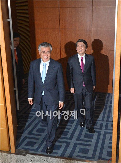 [아시아경제 윤동주 기자] 6일 서울 용산구 백범기념관에서 열린 문재인 민주통합당 대선후보와 안철수 무소속 대선후보간의 단일화 관련 협상을 마친 양 후보가 웃으면서 회담장을 나오고 있다.윤동주 기자 doso7@<ⓒ세계를 보는 창 경제를 보는 눈, 아시아경제(www.asiae.co.kr) 무단전재 배포금지>
