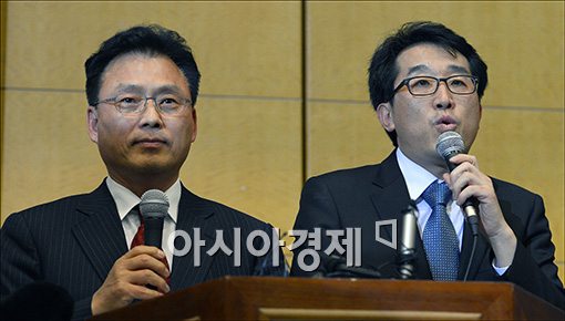[아시아경제 윤동주 기자] 6일 서울 용산구 백범기념관에서 열린 문재인 민주통합당 대선후보와 안철수 무소속 대선후보간의 단일화 관련 협상을 마친후 박광온, 유민영 양 후보 대변인이 공동 합의문을 발표하고 있다.윤동주 기자 doso7@<ⓒ세계를 보는 창 경제를 보는 눈, 아시아경제(www.asiae.co.kr) 무단전재 배포금지>