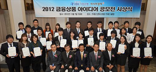 [아시아경제 조강욱 기자] IBK기업은행과 아시아경제신문이 공동 주최한 '2012 금융상품 아이디어 공모전'에서 영예의 대상은 이미은(24ㆍ대구대), 이신애(24ㆍ대구대), 최범구(25ㆍ계명대) 씨로 구성된 '범신미'팀(사진 둘째줄 왼쪽 다섯번째부터)이 차지했다. IBK기업은행과 아시아경제신문 관계자들이 시상식 직후 수상자들과 함께 기념촬영을 하고 있다. 앞줄 왼쪽 앉은 이부터 정환수 IBK기업은행 경영전략본부장, 김영무 아시아경제신문 편집국장, 조준희 IBK기업은행장, 이세정 아시아경제신문 사장, 박주용 IBK기업은행 미래기획실장.조강욱 기자 jomarok@<ⓒ세계를 보는 창 경제를 보는 눈, 아시아경제(www.asiae.co.kr) 무단전재 배포금지>2