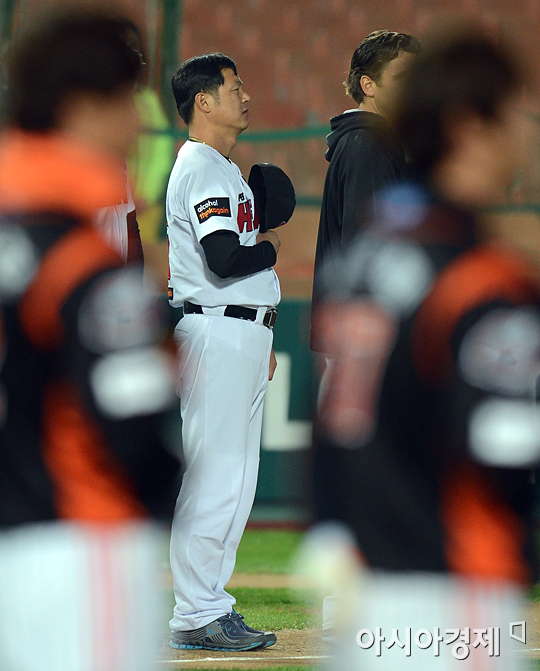 [부산=아시아경제 정재훈 기자] 8일 오후 부산 사직야구장에서 열린 '마구매니저 아시아시리즈 2012' 롯데 자이언츠와 퍼스 히트의 경기에서 퍼스 히트 소속의 구대성이 국민의례를 하고 있다.정재훈 기자 roze@<ⓒ세계를 보는 창 경제를 보는 눈, 아시아경제(www.asiae.co.kr) 무단전재 배포금지>
