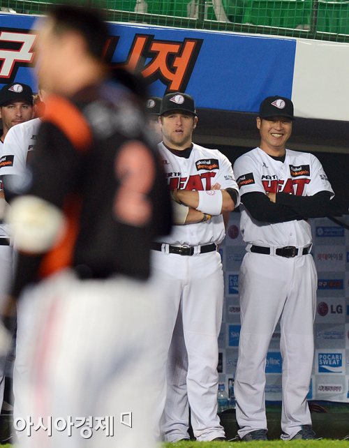 [부산=아시아경제 정재훈 기자] 8일 오후 부산 사직야구장에서 열린 '마구매니저 아시아시리즈 2012' 롯데 자이언츠와 퍼스 히트의 경기에서 구대성이 롯데 선수들을 바라보며 웃고 있다.정재훈 기자 roze@<ⓒ세계를 보는 창 경제를 보는 눈, 아시아경제(www.asiae.co.kr) 무단전재 배포금지>