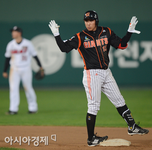 [부산=아시아경제 정재훈 기자] 8일 오후 부산 사직야구장에서 열린 '마구매니저 아시아시리즈 2012' 롯데 자이언츠와 퍼스 히트의 경기 6회초 황재균이 2루타를 친 후 손을 들어보이고 있다.정재훈 기자 roze@<ⓒ세계를 보는 창 경제를 보는 눈, 아시아경제(www.asiae.co.kr) 무단전재 배포금지>