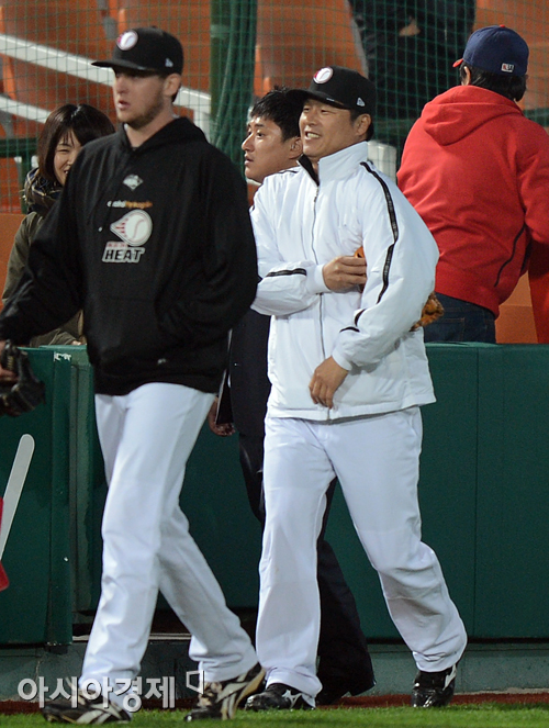 [부산=아시아경제 정재훈 기자] 롯데 자이언츠가 8일 오후 부산 사직야구장에서 열린 '마구매니저 아시아시리즈 2012' 퍼스 히트와의 경기에서 6:1 승리를 거뒀다. 불펜에서 몸을 풀던 구대성이 경기가 끝나자 벤치로 돌아오고 있다.정재훈 기자 roze@<ⓒ세계를 보는 창 경제를 보는 눈, 아시아경제(www.asiae.co.kr) 무단전재 배포금지>