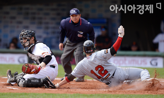 [부산=아시아경제 정재훈 기자] 9일 오후 부산 사직야구장에서 열린 '마구매니저 아시아시리즈 2012' 요미우리 자이언츠와 퍼스히트의 경기 6회초 2사 2루 상황에서 케넬리의 1타점 적시타에 2루주자 애덤스가 홈인하고 있다.정재훈 기자 roze@<ⓒ세계를 보는 창 경제를 보는 눈, 아시아경제(www.asiae.co.kr) 무단전재 배포금지>