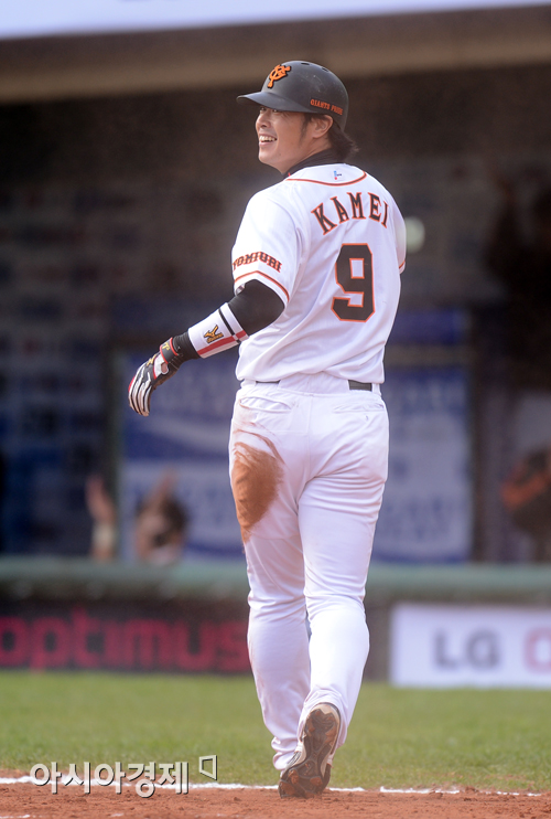 [부산=아시아경제 정재훈 기자] 요미우리 가메이가 9일 오후 부산 사직야구장에서 열린 '마구매니저 아시아시리즈 2012' 요미우리 자이언츠와 퍼스히트의 경기 6회말 무사 1,3루 상황에서 사카모토의 희생플라이에 홈을 밟고 있다.정재훈 사진기자 roze@<ⓒ세계를 보는 창 경제를 보는 눈, 아시아경제(www.asiae.co.kr) 무단전재 배포금지>