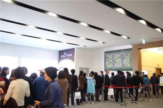 9일 문을 연 '송도 더샵 마스터뷰' 견본주택 유닛에 들어가기 위해 방문객들이 줄을 서고 있다.