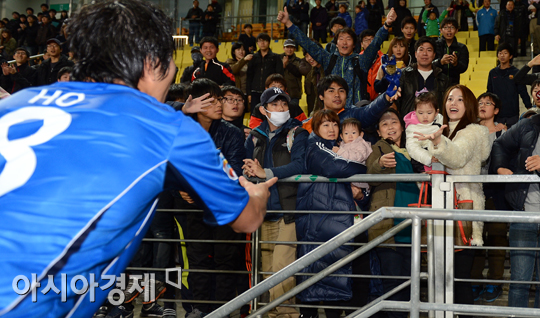 [울산=아시아경제 정재훈 기자] 울산 현대가 10일 오후 울산 문수월드컵경기장에서 열린 '2012 AFC 챔피언스리그' 알 아흘리의 결승전에서 3:0 승리를 거두며 우승 트로피를 들어올렸다. 경기장을 찾은 양은지가 남편 이호로부터 우승 메달을 건네받고 있다.정재훈 기자 roze@<ⓒ세계를 보는 창 경제를 보는 눈, 아시아경제(www.asiae.co.kr) 무단전재 배포금지>