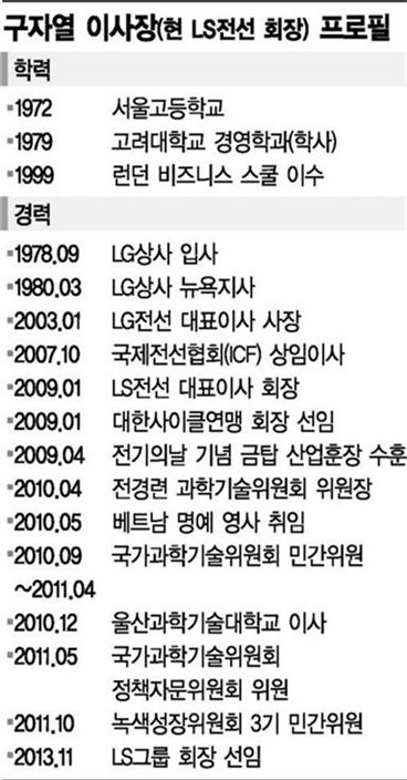 [아시아경제 명진규 기자] LS그룹을 새롭게 이끌 구자열 신임 회장은 육군 병장 출신이다. 구 회장의 프로필에도 항상 육군 병장 제대라는 한 줄이 들어간다. 재벌가 오너 상당수가 군대에 가지 않은 경우가 많은 상황에서 구 회장의 육군 병장 프로필은 인간적인 매력이 돋보인다. 구 회장은 산악자전거 마니아다. 구 회장은 인간 스스로의 한계에 도전하는 스포츠인 산악자전거에 대해 "힘든 일을 정면으로 승부할 때 세상사를 느낀다"고 말한다. 기업 경영과도 빗대어 "누구나 시작은 할 수 있지만 끊임없이 폐달을 밟지 않으면 쓰러진다"고 말한 바 있다. 육군 병장 출신, 산악자전거 마니아 등의 일면에서 알 수 있듯 구 회장의 경영스타일은 적극적이고 도전적이다. "혁신이 없으면 미래가 없다"고 종종 얘기하는 구 회장은 LS전선을 세계 전선시장 3위로 성장시켰다. 한눈팔지 않고 본업에 집중한 결과다. 타 전선회사들이 막대한 자금력을 바탕으로 건설, 부동산 등의 사업에 진출한 뒤 고배를 마시고 있는 점과 대비된다. 1979년 고려대학교 경영학과를 졸업한 구 회장은 졸업 직전인 1978년 LG상사에 입사했다. 이후 1980년 LG상사 뉴욕지사에서 근무한 뒤 1999년 런던 비즈니스 스쿨을 이수했다. 이후 2003년 LG전선 대표이사 사장을 맡으며 본격적인 경영활동을 맡는다. LS가 LG에서 분가한 뒤에는 LS전선 대표이사를 지금까지 역임했다. 구 회장은 다양한 외부 활동을 하며 경력을 쌓아왔다. 2007년에는 국제전선협회(ICF) 상임이사를 맡고 2009년에는 LS전선 대표이사 회장으로 승진했다. 같은 해 대한사이클연맹 회장에도 선임됐다. 이후 2010년에는 전경련 과학기술위원회 위원장을 비롯해 국가과학기술위원회 민간위원, 2011년에는 국가과학기술위원회 정책자문위원회 위원, 녹색성장위원회 3기 민간위원을 맡으며 우리나라 과학기술 발전과 녹색성장에도 일익을 담당했다.