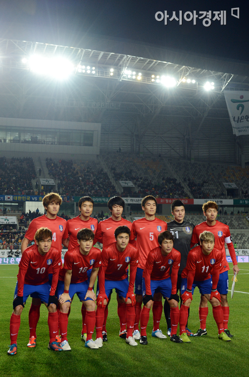 [화성=아시아경제 정재훈 기자] 14일 오후 경기 화성종합경기타운 주경기장에서 벌어진 대한민국과 호주의 친선전에 선발로 나선 태극전사들이 기념촬영을 하고 있다.정재훈 기자 roze@<ⓒ세계를 보는 창 경제를 보는 눈, 아시아경제(www.asiae.co.kr) 무단전재 배포금지>