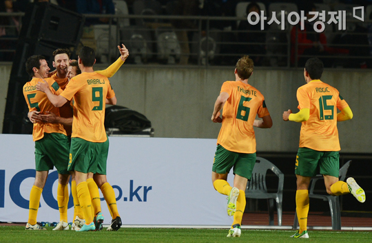 [화성=아시아경제 정재훈 기자] 14일 오후 경기 화성종합경기타운 주경기장에서 벌어진 대한민국과 호주의 친선전에서 코니의 역전골에 기뻐하는 호주 선수들.정재훈 기자 roze@<ⓒ세계를 보는 창 경제를 보는 눈, 아시아경제(www.asiae.co.kr) 무단전재 배포금지>