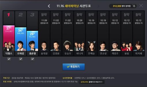 [아시아경제 장영준 기자]'슈퍼스타K4' 사전 투표 결과 딕펑스가 1위를 기록했다.지난 14일 케이블 채널 Mnet '슈퍼스타K' 공식 홈페이지에서 진행 중인 사전투표에서 총 312,329명이 참여한 가운데 딕펑스가 37%의 지지를 얻어 1위를 달리고 있다. 이어 로이킴이 34%, 정준영이 29%로 각각 2위와 3위를 각각 기록했다.하지만 금주 결과를 제외하고 지난 한 달간 사전 인터넷 투표에서 TOP3가 얻은 지지표를 모두 더하면 초박빙의 결과가 나온다. 한 달 간 TOP3를 지지한 모든 표를 100으로 놓고 봤을 때 로이킴이 34,3%, 정준영이 33.5%, 딕펑스가 32,2%의 지지를 받은 것으로 나타났다. 그야말로 살얼음판을 걷는 초박빙 승부라 할 수 있다.이들 세 팀의 지지층도 엇갈린다. 한 달간의 사전 인터넷 투표 결과를 보면 10대에서는 정준영이, 20대에서는 딕펑스가, 30대에서는 로이킴이 가장 많은 표를 얻었다. 10대, 20대, 30대 표를 정준영, 딕펑스, 로이킴이 절묘하게 나눠먹는 형국이다. 또 정준영은 남성, 로이킴은 여성에게서 가장 많은 표를 얻었다. 열혈 지지층 외 숙제로 남아있는 타깃도 제각각이다. 딕펑스는 30대와 여성, 정준영은 20대, 로이킴은 남성에게서 모두 최하위를 기록했다. 홍대광 지지표를 흡수하면서 약점을 보이고 있는 지지층의 마음을 얼마나 돌려놓을 수 있을 지가 결승 진출을 가르는 핵심 포인트가 될 전망이다.'슈퍼스타K4' 김태은 PD는 "이번 시즌 출연자는 서로 다른 매력만큼이나 성별 연령별로 각기 다른 강력한 팬덤이 형성돼 있다"며 "이 같은 사실은 순위 여부와 상관없이 이들이 가요계에 데뷔했을 때 훌륭한 자양분이 될 것"이라고 내다봤다.한편, 오는 16일 열리는 TOP3 공연에서는 한 팀이 탈락하고 대망의 결승진출팀이 가려질 전망. 또 '슈퍼스타K'만의 전통인 '슈퍼시상식'이 함께 열려 올 시즌 화제의 인물들이 대거 출연할 것으로 보인다.장영준 기자 star1@<ⓒ아시아경제 & 스투닷컴(stoo.com)이 만드는 온오프라인 연예뉴스>