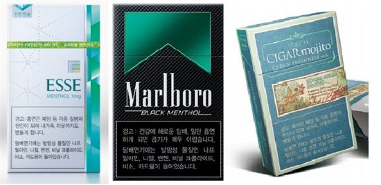 12월 8일부터 제품명을 바꿔야 하는 담배 제품들. 왼쪽부터 KT&G의 에쎄멘솔1mg, 필립모리스코리아의 말보로블랙멘솔, KT&G의 보헴시가모히토