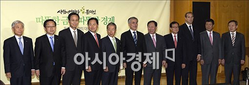 ▲16일 문재인 민주통합당 대선 후보가 명동 은행회관에서 주요 시중은행장들과 간담회를 갖고 기념촬영을 하고 있다. 왼쪽부터 이주형 수협은행장, 김종준 하나은행장, 민병덕 국민은행장, 서진원 신한은행장, 윤용로 외환은행장, 문재인 후보, 박병원 은행연합회장, 이순우 우리은행장, 리차드 힐 SC은행장, 조준희 기업은행장, 신충식 농협은행장
