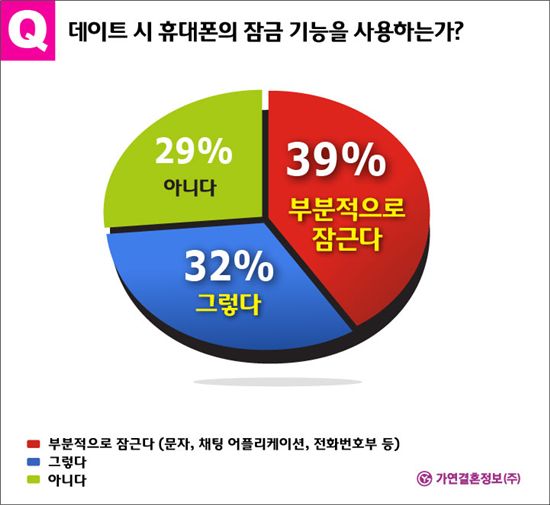 [아시아경제 오주연 기자] 연인에게 내 휴대폰을 거리낌없이 보여줄 수 있을까? 데이트 시 휴대폰의 ‘잠금 기능’을 사용하는 남녀의 비율이 그렇지 않은 경우보다 높은 것으로 나타났다.25일 결혼정보회사 가연과 가연이 운영하는 프리미엄 매칭 사이트 안티싱글은 미혼남녀 300명을 대상으로 설문 조사한 결과, 10명 중 7명이 데이트 시 휴대폰의 잠금 기능을 사용하고 있다고 밝혔다. 전체 응답자 중 71%가 휴대폰 잠금 기능을 부분·전체적으로 사용한다고 답한 것.이 중 문자나 전화번호부 등 일부 기능에서 잠금을 사용한다고 답한 비율은 39%였으며 전체 기능의 잠금을 사용하는 비율은 32%였다.