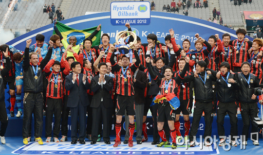 [아시아경제 정재훈 기자] FC서울이 25일 오후 서울월드컵경기장에서 열린 '현대오일뱅크 K리그 2012' 전북 현대의 경기에서 1:0 승리를 거둔 후 정규리그 우승 시상식을 가졌다.정재훈 사진기자 roze@<ⓒ세계를 보는 창 경제를 보는 눈, 아시아경제(www.asiae.co.kr) 무단전재 배포금지>