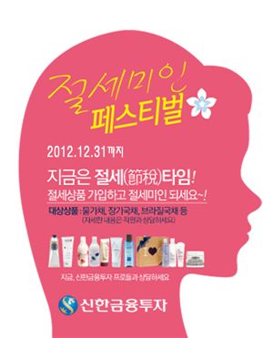 [아시아경제 송화정 기자]신한금융투자는 절세상품 가입 고객들에게 100% 사은품을 제공하는 '절세미인 페스티벌'을 다음달 31일까지 1개월 동안 연장한다고 27일 밝혔다. 이번 행사는 신한금융투자가 추천하는 절세상품(브라질 국채 및 물가채, 장기채권 등)에 가입하면 사은품을 제공하는 이벤트다. 행사 기간을 한달 연장하면서 대상상품 또한 해외채권(중국은행 딤섬CD, 달러표시 롯데쇼핑채권과 우리은행채권 등)까지 확대했다. 3000만원 이상 가입 고객이 사은품 지급 대상이다. 가입자에게는 록시땅 핸드크림, 비오템 화장품 등을 제공하며 1억 이상 가입자에게는 키엘, 랩시리즈, 바디샵 화장품 등을 증정한다. 이벤트 대상 상품 및 행사에 관한 자세한 내용은 신한금융투자 홈페이지(www.shinhaninvest.com), ARS(1600-0119) 또는 신한금융투자 전국지점을 통해 확인할 수 있다. 김운배 마케팅팀 부장은 "1년 중 절세상품에 대한 문의가 가장 많은 때가 지금"이라며 "절세효과와 함께 사은품 혜택까지 누리는 스마트한 고객들이 많아지길 바란다"고 말했다.