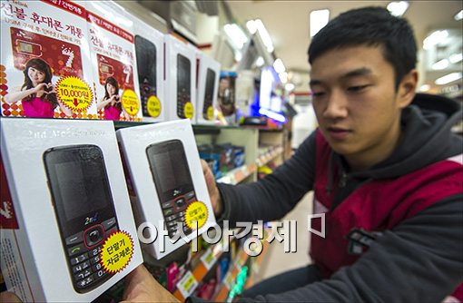 [아시아경제 윤동주 기자] 29일 서울 소공동 세븐일레븐 직원이 이날부터 판매를 시작하는 8만원대(84,900원) 휴대폰 ‘세컨드(2nd)‘를 판매대에 진열하고 있다. 8만원대 휴대폰 세컨드는 음성통화와 문자메세지등 단순 기능을 갖춘 피처폰이지만 라디오, MP3, 카메라등의 기능은 탑재되어 있고 유심카드를 두 개 꽂을 수 있는 것이 특징이다.윤동주 기자 doso7@<ⓒ세계를 보는 창 경제를 보는 눈, 아시아경제(www.asiae.co.kr) 무단전재 배포금지>