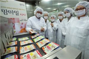 매일유업의 '맘마밀 보글보글' 안심 투어 프로그램에 참가한 소비자들이 여러 공정을 거쳐 생산되는 이유식 생산과정을 직접 체험하고 있다.