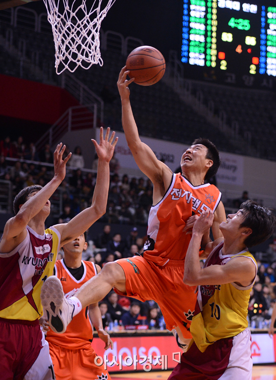 [고양=아시아경제 전성호 기자]인천 전자랜드가 '대학 최강' 경희대를 맞아 대역전극을 펼치며 프로의 자존심을 세웠다. 전자랜드는 29일 오후 고양실내체육관에서 열린 2012 KB 국민카드 프로-아마 농구 최강전 16강 경기에서 경희대를 65-63으로 꺾고 8강에 합류했다. 차바위는 고비 때마다 3점포를 터뜨리는 등 21점을 꽂아 넣어 승리의 일등공신이 됐다. 전자랜드는 1일 열리는 성균관대-고양 오리온스전 승자와 3일 8강전을 치른다.프로팀으로서 전자랜드의 저력이 돋보인 경기였다. 줄곧 경희대에 끌려가다 4쿼터 막판 뒤집기에 성공했다.경기 초반은 경희대의 흐름이었다. 대학리그 MVP 김민구와 국가대표 센터 김종규를 앞세워 선전을 펼쳤다. 김민구는 전반에만 양팀 통틀어 최다인 14점 7라바운드를 기록했고, 도움과 가로채기도 각각 3개와 2개를 기록하며 공수 모두에서 고른 활약을 펼쳤다. 김종규도 6득점 5리바운드 2블록샷으로 힘을 보탰다. 전자랜드는 정병국이 10득점, 차바위가 9득점 4리바운드로 분전했지만, 1쿼터 44%에 그친 낮은 야투율과 저조한 수비 리바운드로 줄곧 주도권을 뺏어 오지 못했다. 설상가상 강혁이 2쿼터 도중 발목 부상을 당해 벤치로 물러나기도 했다. 결국 전반은 경희대가 34-33으로 한 점 앞선 채 마무리가 됐다.후반 들어서도 경희대는 주도권을 놓치지 않았다. 특히 김민구는 적극적인 돌파와 예리한 패스를 앞세워 공격을 주도했고, 3쿼터에만 무려 9점을 넣었다. 3쿼터가 끝날 즈음 경희대는 49-41로 크게 앞서나갔다. 4쿼터 들어 전자랜드의 대반격이 시작됐다. 차바위가 3점슛 세 개를 내리 성공시켰고, 이현호와 정병국까지 3점포를 지원했다. 반면 경희대는 주전들이 체력적으로 문제를 드러내며 급격하게 무너졌다. 마침내 종료 5분여를 남기고 전자랜드는 54-51로 전세를 뒤집었다. 경희대도 마지막까지 저항했다. 김종규가 잇달아 투핸드 덩크를 꽂아넣으며 59-61까지 추격했다. 하지만 종료 40여초 전 속공 상황에서 김민구가 공격자 파울을 범하고 말았고, 곧바로 실점을 허용하며 경기를 다시 뒤집지는 못했다. 결국 전자랜드가 65-63으로 승리를 거뒀다.전성호 기자 spree8@<ⓒ세계를 보는 창 경제를 보는 눈, 아시아경제(www.asiae.co.kr) 무단전재 배포금지>