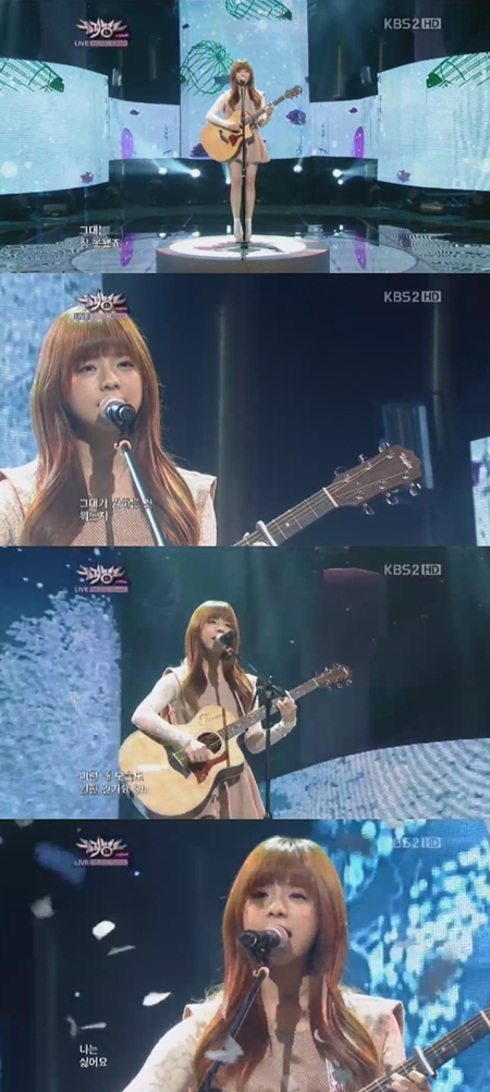 [아시아경제 이금준 기자] 가수 주니엘이 완벽한 무대로 '마성의 매력'을 발산했다.주니엘은 30일 오후 방송한 KBS2 '뮤직뱅크'에 출연해 신곡 '나쁜남자'의 무대를 선사했다. 이날 기타를 매고 원형 단상에 올라선 주니엘은 특유의 청순미를 과시하며 삼촌 팬들을 설레게 만들었다.특히 흔들림 없는 가창력을 과시한 것은 물론 트레이드마크인 자연스러운 기타 연주를 선사하며 '대세'임을 입증했다. 주니엘의 무대에는 객석의 뜨거운 환호와 함성이 이어졌다.신곡 '나쁜사람'은 주니엘의 애절한 목소리가 돋보이는 팝 곡. 이별에 상처받아 아파하는 여자의 마음을 담고 있다. 깊은 독백처럼 연주되는 어쿠스틱 기타, 피아노 연주가 애절한 멜로디와 조화를 잘 이뤄 감성을 자극한다.한편 이날 '뮤직뱅크'에는 동방신기, 손담비, 노을, 김성규, B1A4, NS윤지, 보이프렌드, 씨클라운, 주니엘, 빅스타, 달샤벳, 투빅, 스피카, 오프로드, 타히티, 원더보이즈, 걸스데이 등이 출연했다.이금준 기자 music@<ⓒ아시아경제 & 스투닷컴(stoo.com)이 만드는 온오프라인 연예뉴스>