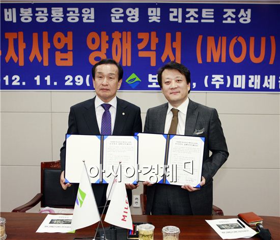 전남 보성군(군수 정종해)은 지난달 29일 투자자인 (주)미래세움 관계자, 보성군의회 의장을 비롯한 의원, 군청 실과소장 등 30여 명이 참석한 가운데 비봉공룡공원 운영 및 최고급 가족형 리조트 조성 양해각서(MOU)를 체결했다.이번 협약을 통해 (주)미래세움(대표 최석중)은 남해안의 조망이 아름다운 득량만 비봉공룡공원 일원에 민간 자본 50억 원을 투자하여 가장 한국적이면서 세계적으로 차별화된 최고급 가족형 리조트를 조성하여 관광객 유치에 나선다는 계획이다.전시연출 전문기업인 (주)미래세움은 전년도 매출액이 330억 원대에 육박하고 중국, 일본 등에 대형 전시 연출 프로젝트를 추진하고 있는 글로벌 기업이다.협약의 주요 내용으로는 비봉공룡공원 운영 및 최고급 리조트 조성사업으로 투자방식은 BTO방식이다. 시설 준공 후 보성군이 소유권을 가지며 수익형 민자사업으로 추진하는 방식이다.또한 현재 조성중인 비봉공룡공원 관리·운영도 함께 위탁함으로서 타 지역 해남·고성 공룡공원 등과 차별화된 운영계획을 수립 관람객을 유치함으로서 관광산업 발전에도 크게 기여할 것으로 기대된다.정종해 보성군수는 “본격적으로 사업이 추진되기까지 많은 단계를 거치고 법적인 부분의 행정절차도 따를 것이다”며 “본 사업이 실현되어 보성 관광발전에 큰 도움이 될 수 있도록 적극적인 행정지원을 하겠다”고 말했다.또한 "앞으로 보성군은 협상대상자로 지정하기 전까지 투자자가 제안한 제안서를 공공투자관리센터 검토 의뢰하여 사업성 여부를 확인할 계획이며 사업성이 있다고 판단 될 경우 제3자 공고를 통하여 공정성, 투명성을 확보할 계획"이라고 말했다.미래세움 최석중 대표는 “보성군은 판소리와 녹차 등 관광자원이 풍부하다”면서 “보성을 찾는 관광객이 체류할 수 있도록 다양한 볼거리가 있는 대한민국 최초의 테마가 있고 기억에 남을 수 있는 리조트를 조성하여 보성군의 관광활성화를 통해 고용창출과 함께 지역경제도 좋아질 것”이라고 말했다.한편 보성군은 득량면 비봉리 일원에 공룡생태관, 멀티미디어 공연 등을 테마로 비봉공룡공원을 2014년 12월 완공을 목표로 추진하고 있다.노해섭 기자 nogary@ <ⓒ세계를 보는 창 경제를 보는 눈, 아시아경제(www.asiae.co.kr) 무단전재 배포금지>