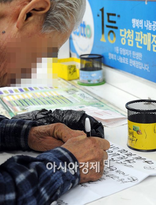 [아시아경제 백소아 인턴 기자] 로또 발행 10주년을 앞둔 1일 복권 명당으로 알려진 서울 노원구 한 편의점에서 한 백발의 어르신이 적어온 로또 번호들을 확인하고 있다. 지난 10년 동안 대한민국 성인은 1인당 평균 73만원의 복권을 구매하였고 1등 당첨자는 모두 2,956명이다.백소아 인턴 기자 sharp2046@<ⓒ세계를 보는 창 경제를 보는 눈, 아시아경제(www.asiae.co.kr) 무단전재 배포금지>