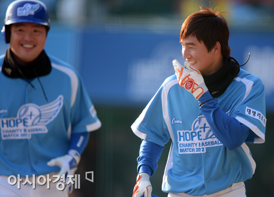 [수원=아시아경제 정재훈 기자] 2일 수원야구장에서 열린 양준혁 재단 주최 '2012 희망더하기 자선야구대회'에서 5회초 통일팀 김상수가 쓰리런 홈런을 친 뒤 기뻐하고 있다. 정재훈 기자 roze@<ⓒ세계를 보는 창 경제를 보는 눈, 아시아경제(www.asiae.co.kr) 무단전재 배포금지>