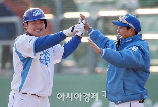 [수원=아시아경제 정재훈 기자] 2일 수원야구장에서 열린 양준혁 재단 주최 '2012 희망더하기 자선야구대회'에서 5회말 박병호가 적시타를 때린 뒤 기뻐하고 있다.정재훈 기자 roze@<ⓒ세계를 보는 창 경제를 보는 눈, 아시아경제(www.asiae.co.kr) 무단전재 배포금지>