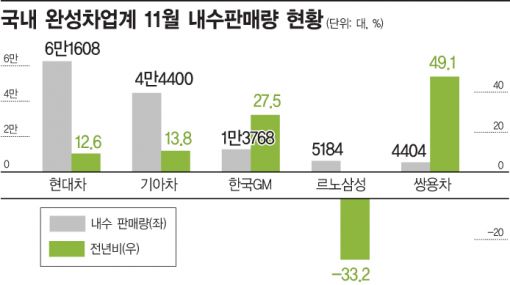 [아시아경제 조슬기나 기자]"내년이 걱정이다." 지난달 내수 시장에서 연중 최대실적을 기록한 국내 완성차 업체들이 울상이다. 당장은 기대 이상의 성적표를 받았지만 내년 이후 전망이 불투명한 까닭이다. 지금의 좋은 성적이 내년부터 독이 될 것이라는 우려 섞인 전망까지 제기된다. 4일 관련업계에 따르면 현대차는 11월 한달간 국내에서 전년 대비 12.6% 증가한 6만1708대를 판매했다. 이는 지난해 3월 이후 최대판매량이자 연중 최대치다. 차종별로는 아반떼가 9932대로 가장 많이 팔렸고, 쏘나타 8997대, 그랜저 7736대 등을 기록했다. 전체 판매는 늘었지만 1만대 클럽에는 두달 연속 이름을 올리지 못했다.