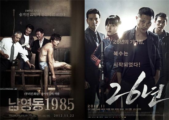 [아시아경제 김재범 기자]5일 영화관입장권 통합전산망 집계에 따른 4일자 일간 영화 박스오피스를 보면 흥미로운 점이 있다. 영화 ‘26년’과 ‘남영동1985’의 성적이다. ‘26년’은 평일임에도 평균 10만 명이 넘는 관객 몰이를 하고 있다. 스크린 수도 580개에 하루 상영횟수 2319회에 이른다. 독과점 논란에 휩싸였던 ‘광해, 왕이 된 남자’가 흥행세를 유지하던 10월 중순 쯤 스크린 수 600개, 상영횟수 2600회와 큰 차이가 없다.반면 같은 날 박스오피스 9위(10위는 4일 언론시사회가 열린 ‘반창꼬’였다) ‘남영동1985’가 차지했다. 일일 관객 수 5000명 이하로 떨어졌고, 스크린 수도 203개에 상영횟수도 451회에 불과하다. 이미 ‘퐁당퐁당’(교차상영)으로 빠져버린 상태다.두 영화의 경우 한때 국가 권력의 최고봉에 선 ‘그 사람’을 직간접적으로 그린다. 먼저 ‘26년’은 광주민주화항쟁의 시발점인 ‘그 사람’을 단죄하기 위한 사람들의 극비 프로젝트로, 인기 웹툰 작가 강풀의 동명 원작이 모티브다. 탄탄한 원작의 구성력과 통렬한 스토리의 전개는 독자들에게 큰 카타르시스를 전해줬고, 독재자이자 학살자로서 국민들의 가슴에 비수를 꽂은 ‘그 사람’은 더욱 얄 굳은 존재감이 됐다.현재 '26년‘에 대한 평은 극과 극이다. ‘현대사에 대한 재조명이다’ 혹은 ‘통쾌함에 온몸이 짜릿했다’는 반응이다. 반면 혹평도 존재한다. ‘원작의 구성력에서 그 사람만 따왔냐’ ‘너무 안일한 완성도에 실망했다’ 등도 나온다. 일부에선 제작 두레 등 온 국민에 대한 관심도를 끌어 온 것에 비해 짜임새나 구성력이 너무 떨어진다는 지적도 있다. 제작과 개봉 시기를 맞추기 위해 급조된 느낌이 크다는 것.이런 분위기는 ‘그 사람’에 대한 안 좋은 감정을 일종의 팬덤으로 만들어 버리고 있다. 한 평론가는 ‘26년’에 대한 혹평을 했다가 영화 제작진과 네티즌들에게 집중포화를 맞기도 했다.반면 ‘남영동1985’는 상당히 견고하고 획기적인 영화적 시도와 확실한 메시지 등을 담고 있음에도 고전을 면치 못하고 있다. ‘부러진 화살’로 폭발적인 인기를 끈 정지영 감독의 신작이란 사실에 큰 관심이 쏟아졌다. 올해 부산국제영화제 상영당시 국내 언론은 물론 외신들도 엄지손가락을 추켜세우며 영화에 감탄했다.‘고문’이란 소재와 한정된 공간에서의 서사구조 등이 분명한 ‘남영동1985’의 약점이다. 하지만 단순화시킨 미장센과 당시 권력자가 만들어 낸 비이성적 사고관의 가해자들, 그리고 시대의 권력에 피해자가 된 고 김근태 의원의 모습을 그리며 여러 질문을 하게 만든다. 두 영화는 아이러니하게도 ‘그 사람’에 대한 공통된 묘사를 담는다. ‘26년’은 학살자로서 ‘그 사람’을 죽여야 한다는 내용이다. 반면 ‘남영동1985’에는 전혀 언급되지 않는다. 단 ‘그 사람’의 집권 시기 중 최고조였던 1985년을 배경으로만 한다. 관객들의 감정을 건드리는 방법에서 ‘26년’은 솔직했고, ‘남영동1985’는 에둘러 그 사람이 만든 시대의 긴장감에만 주목했다. 관객들은 솔직함에 주목했고, ‘26년’의 흥행세로 이어졌다.이런 분위기는 '26년'의 배급에서 손을 땐 대기업 배급사들을 돌려 놓고 있다. 현재 ‘26년’의 경우 지난달 30일 481개 스크린에서 하루 뒤인 12월 1일 609개로 껑충 뛰었다. 반면 ‘남영동1985’는 같은 날 216개에서 199개로 빠졌다.‘26년’은 총 제작비 46억 원이 투입된 영화다. 충무로 기준으로 결코 작지 않은 규모의 영화다. 이 가운데 1만 5000명이 참여한 제작 두레가 7억원, 가수 이승환이 10억 원을 냈다. 이에 반해 ‘남영동1985’은 5억 원이 들었다.청룡영화상 남우주연상 수상자인 최민식은 수상 소감에서 “작은 영화와 큰 영화의 상생 방안을 고민해 보자”고 말했다. 같은 시기 같은 맥락을 그린 두 영화의 상반된 행보가 극소수에게 또 다른 시선을 갖게 만들고 있다.김재범 기자 cine517@<ⓒ아시아경제 & 스투닷컴(stoo.com)이 만드는 온오프라인 연예뉴스>