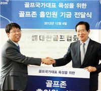 골프존이 4일 대한골프협회(KGA)에 선수 육성 기금 1800만원을 쾌척했다. 스크린골프를 이용한 일반인들이 자신의 홀인원 상금 일부를 기부해 마련됐다. 국가대표 육성을 위한 훈련비로 사용된다. 장성원 골프존 전무(사진 왼쪽)는 "2016년 리우올림픽에서 좋은 성적을 거두기를 기원하는 의미"라며 "나눔 활동에 동참해 준 고객들께 감사하다"고 전했다. 골프존은 지난달 태릉선수촌에 골프 국가대표 훈련시스템을 기증했고, 매년 유소년 골프 꿈나무 육성을 위한 장학금을 지급하는 등 선수 양성을 위한 다양한 활동을 펼치고 있다. <ⓒ세계를 보는 창 경제를 보는 눈, 아시아경제(www.asiae.co.kr) 무단전재 배포금지>