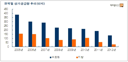 [아시아경제 박미주 기자]부동산 경기침체의 장기화로 상가시장도 공급이 정체된 모습을 보이고 있다. 신규 상가 공급이 눈에 띄게 줄었다. 수도권 쏠림현상도 나타났다. 지방보다 수도권 인근에 택지개발지구가 많아서다. 상가 매매가는 상승세를 유지했다. 오피스 역시 거래는 줄었으나 가격은 상승했다. 부동산펀드(REF)를 중심으로 대형 오피스 거래가 이뤄졌기 때문으로 풀이된다.◆상가 공급 32% 감소.. 가격은 7% 상승= 5일 부동산정보업체 부동산114에 따르면 올해 기준 신규공급 상가는 163개로 지난해보다 32% 감소했다. 2007년 400건 미만에서 2011년 300건 미만으로 줄어든 뒤 올해는 200건 미만을 기록했다. 공급 감소세가 커진 셈이다.특히 지방에서 이런 현상이 두드러진다. 신규택지개발이 수도권 중심으로 진행되며 상가 공급도 수도권으로 편중되고 있어서다. 지방은 혁신도시 등의 개발호재가 아직 초기단계에 머무르며 상가공급도 더디게 진행된 영향이 크다.유형별로는 가격수준이 높은 근린상가와 복합상가의 공급량 감소가 크게 나타났다. 반면 상대적으로 확보된 배후수요가 있고 가격경쟁력이 있는 단지내상가나 오피스텔 상가 감소는 크지 않았다. 상가 가격은 상승세를 유지했다. 2012년 기준 신규 공급된 상가의 1층 평균 분양가격은 3.3㎡당 2578만원으로 지난해보다 7% 가량 상승했다. 이는 부동산 시장 고점이던 2007년 2599만원 이후 가장 높은 수준이다. 올해 강남보금자리와 광교 등 유망택지지구에서 상가공급이 진행되며 상대적으로 높은 가격수준이 유지된 영향이다. 한국토지주택공사(LH) 단지내상가도 공급이 줄었지만 투자자들의 관심도는 여전한 것으로 분석됐다. 올해 공급된 LH 단지내상가는 총 154호로 예년의 4분의 1수준에 불과했다. 상반기 낙찰률도 80%까지 하락했다. 하지만 하반기에는 100%를 기록했고 낙찰가율도 150% 수준을 유지했다. 3.3㎡당 낙찰가는 강남보금자리 단지내상가 때문에 2295만원이라는 높은 가격수준을 보였다. 그럼에도 낙찰총액은 시장 축소로 344억원에 그쳤다. 이는 세종시 물량이 공급됐던 작년 1403억원의 25%수준이다.