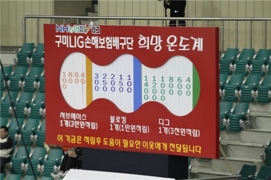 [아시아경제 김흥순 기자]남자 프로배구 LIG손해보험이 2012-2013 V리그에서 선수단의 개인 기록에 따른 '희망나눔기금'을 적립한다. 우선 시즌 중 작성되는 서브에이스 1개당 3만원, 블로킹 1개당 1만원, 디그 1개당 3천원을 적립하게 된다. 선수단은 강력한 서브를 구사하는 까메호와 김요한이 가장 많은 서브에이스 금액을 적립할 것으로 기대하고 있다. 이와 함께 올 시즌 1위를 달리는 블로킹 부문과 리베로 부용찬을 중심으로 한 디그에서도 시즌 종료 때까지 많은 금액이 모일 전망이다.LIG손해보험은 홈 구장인 구미 박정희 체육관에 LIG희망온도계를 설치하고 3가지 부문 기록을 매 경기 집계하고 있다. 구단은 적립된 기금을 시즌 종료 후 도움의 손길이 필요한 곳에 사용할 계획이다.김흥순 기자 sport@<ⓒ세계를 보는 창 경제를 보는 눈, 아시아경제(www.asiae.co.kr) 무단전재 배포금지>김흥순 기자 sport@<ⓒ아시아 대표 석간 '아시아경제' (www.newsva.co.kr) 무단전재 배포금지>
