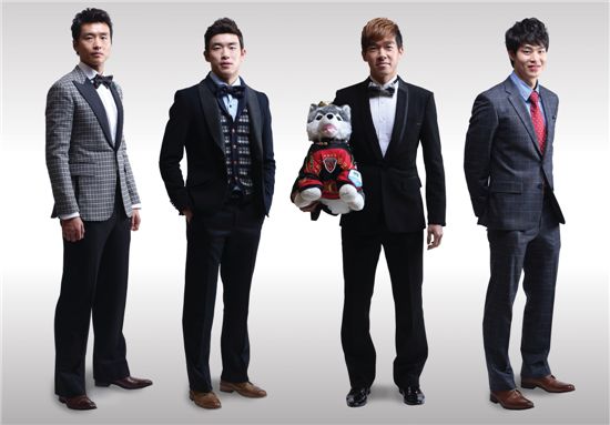 K리그 시상식 최고의 패셔니스타로 꼽힌 이동국(전북현대), 윤석영(전남드래곤즈), 황진성(포항스틸러스), 한지호(부산아이파크) *왼쪽부터 [사진=한국프로축구연맹 제공]<br /> <br />