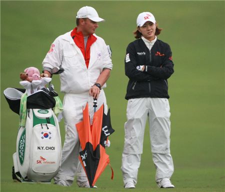 최나연(오른쪽)이 스윙잉스커츠 최종일 7번홀에서 캐디와 코스 공략을 의논하고 있다. 사진=KLPGA제공