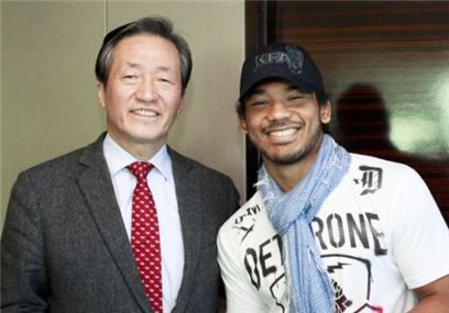 [아시아경제 이경호 기자] 새누리당 정몽준 공동선대위원장이 10일 전날 2차 방어전에 성공한 미국 종합격투기 UCF 라이트급 챔피언 벤슨 헨더슨과의 인연을 소개했다. 정 위원장은 이날 트위터에 "UFC세계챔피언 벤 헨더슨 선수의 2차 방어 성공을 축하한다"면서 "미군아버지와 한국인 어머니 사이에서 태어난 벤은 링에서는 거칠지만 미소가 수줍은 토종 김치파이터"라고 말했다. 그는 "금년 초 만났을때 저를 보고 몽준이형이라고 (말해) 우리말도 잘하더라"면서 "멋진동생. 잘했다"고 말했다. 정 위원장은 그러면서 헨더슨과 같이 찍은 사진을 올려놨다. 이경호 기자 gungho@<ⓒ세계를 보는 창 경제를 보는 눈, 아시아경제(www.asiae.co.kr) 무단전재 배포금지>