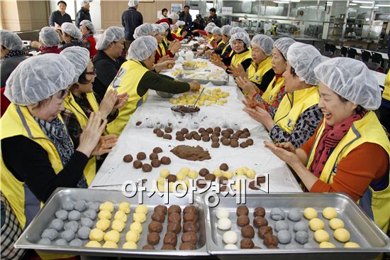 빛고을노인복지재단은 10일 오후 빛고을 타운 후생관 식당에서 재단 직원, 회원, 자원봉사자 등 100여 명이 참석 가운데 우리밀 찐빵 1300여 개를 손수 빚는 나눔 행사를 펼쳤다.