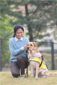 최수연씨가 삼성화재에서 받은 안내견 온유와 사진 촬영을 하고 있다.